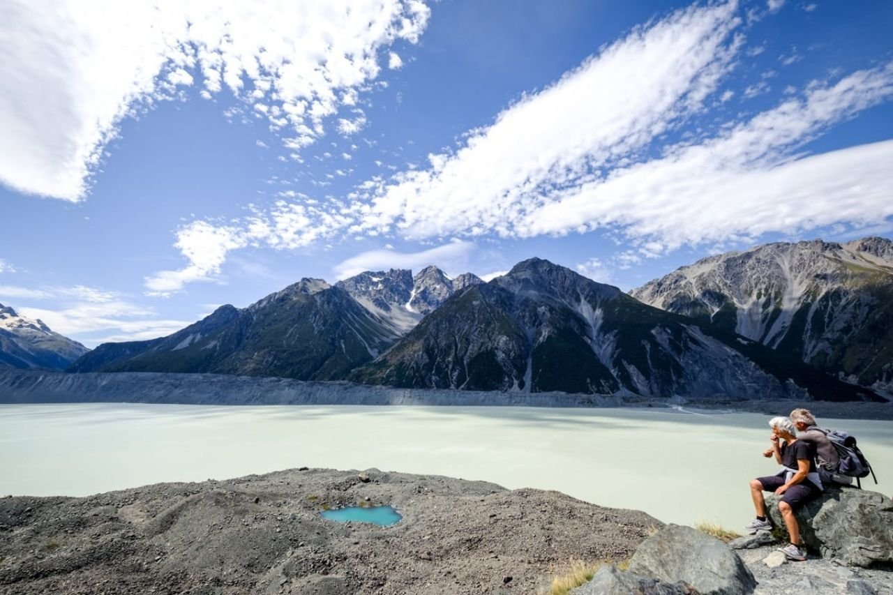 Θα θελήσετε να βγάλετε πολλές φωτογραφίες στον περίπατο Tasman Glacier Walk, επειδή το σημείο θέασης στην κορυφή προσφέρει υπέροχη πανοραμική θέα της λίμνης Tasman, των μικρών παγόβουνων, του κάτω παγετώνα (ο οποίος υποχωρεί), των Blue Lakes και των γύρω βουνών.